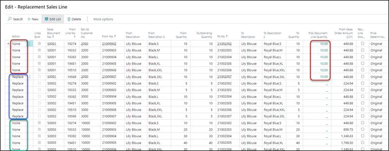 When the Replacement Sales Lines are created, the Action will be set by the system automatically but can be changed: