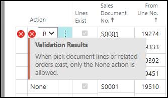 No Action will be conducted, because there are already existing Sales Lines with the To No. Item or because there are already Quantities on a Pick Document Line or because there is a Related Order connected to the Sales Line. This can be seen in the fields on the Replacement Sales Lines if you scroll to the right. If you try to change the None into Replace or Delete and the Sales Line is already on a Pick Document, or there is a Related Order, an error message will appear:
