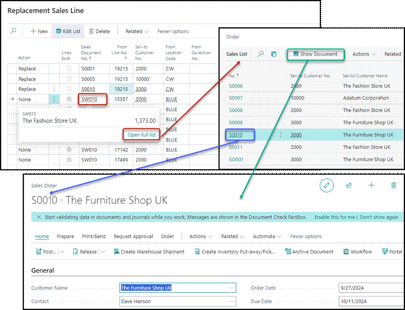 You can see the information of the current Replacement Sales Line by click on the Sales Document No. and then click Open full list and in the Sales List click Show Document.